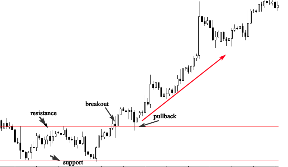 As shown in the example, the market was previously trading between support and resistance levels, and then the price suddenly broke out above the resistance level. This breakout suggests that the market may be entering a new trending phase. The ideal entry point is typically after the breakout, as this confirms the trend’s direction.