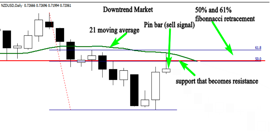 When all three elements align, you can enter the market right after the pin bar closes, placing your stop loss above the long tail. Your profit target will be the next support level in a downtrend.