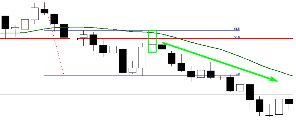 - The Fibonacci Retracement: The pin bar is also rejected from the 50% Fibonacci retracement level, which is a powerful key level. This adds further confidence that the market is likely to continue lower.