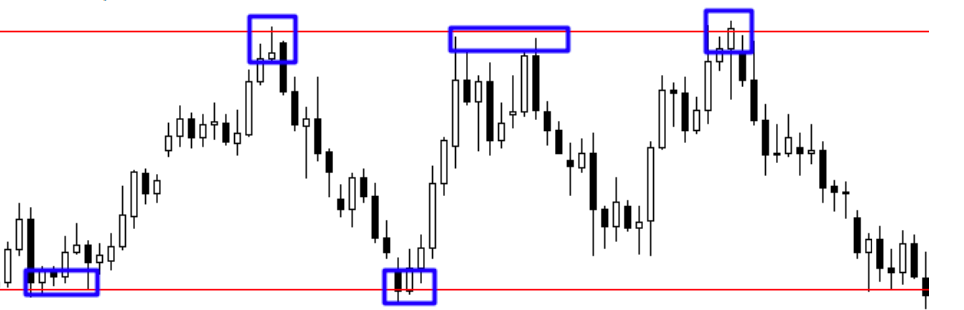 When prices begin trading horizontally between a defined level of support and a defined level of resistance without making any higher highs or lows, we can say that the market is ranging.