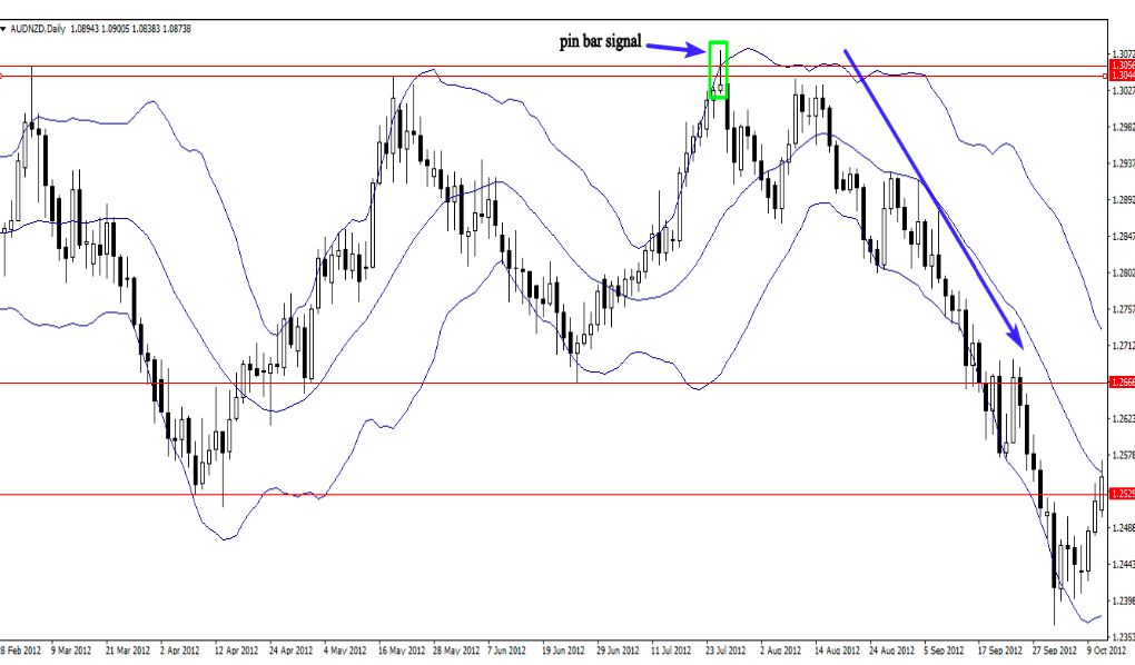 The daily chart above demonstrates how this indicator might provide us with the confidence to execute our trades; the pin bar’s erroneous breakthrough of the resistance level was a strong indication to short the market. The false breakout of the upper band further supported the trade.